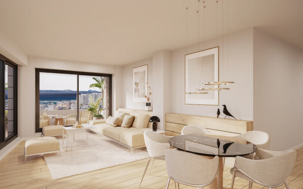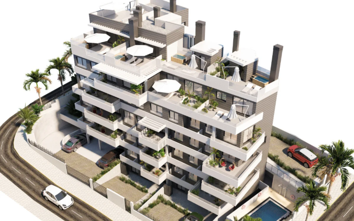 De ontwikkeling bestaat uit 22 exclusieve appartementen en penthouses met 2 en 3 slaapkamers, inclusief duplex- en triplexvarianten met ruime terrassen en uitzicht op zee. Elk appartement beschikt over een eigen parkeerplaats. De open woonruimtes, moderne keuken en grote ramen zorgen voor veel licht en een gevoel van ruimte. Op het dakterras bevindt zich een zwembad met solarium – de perfecte plek om te ontspannen onder de Spaanse zon.